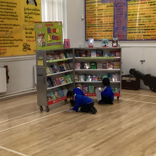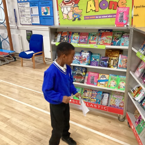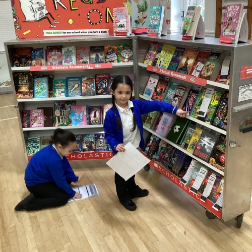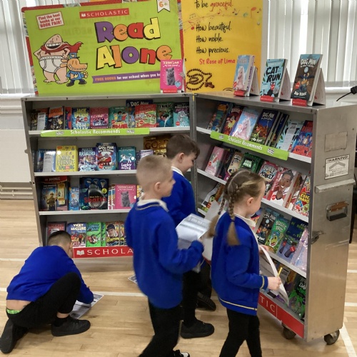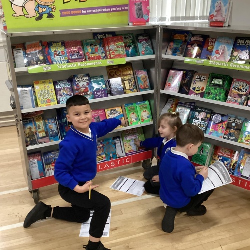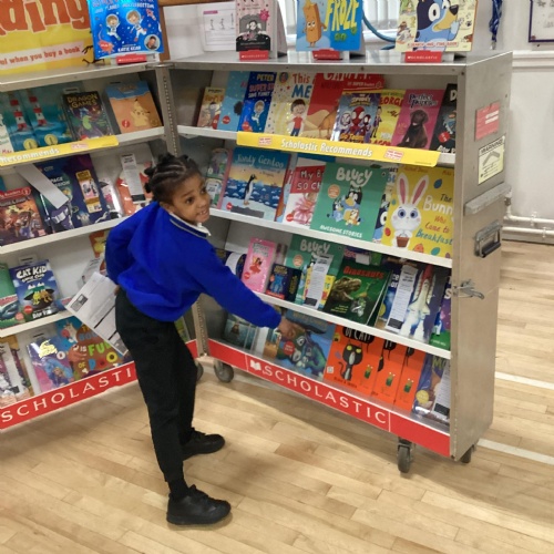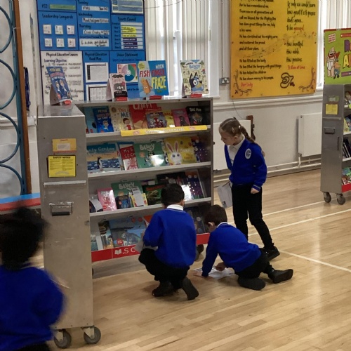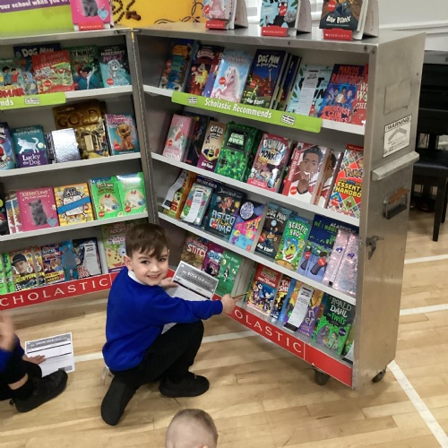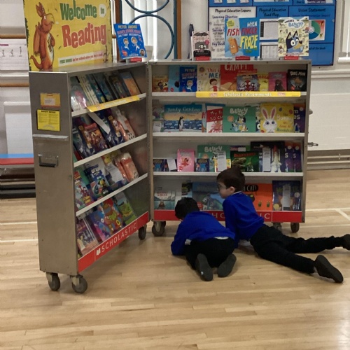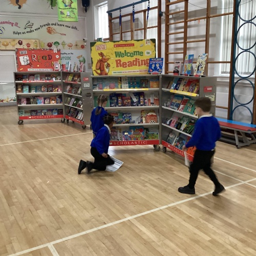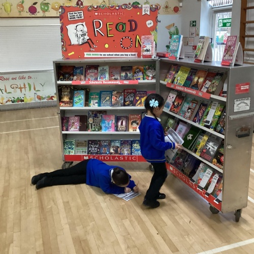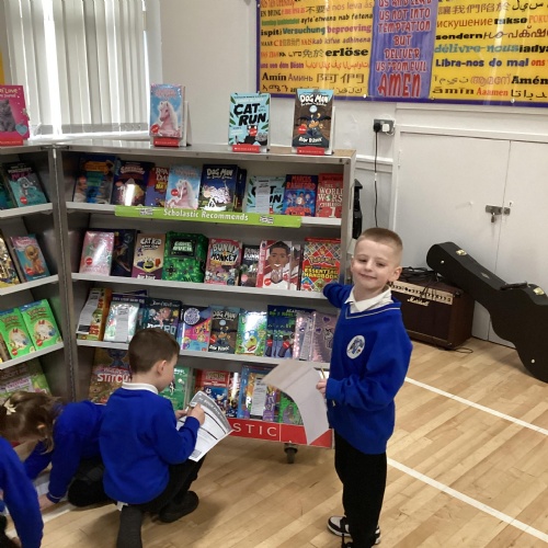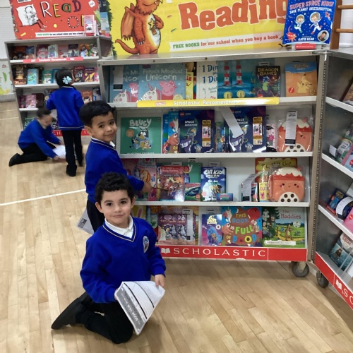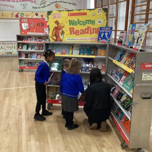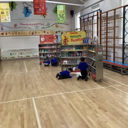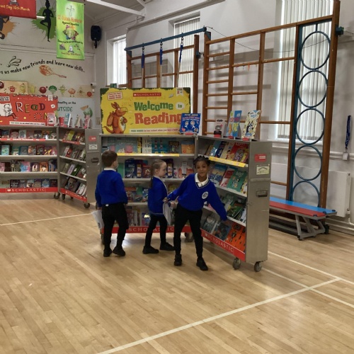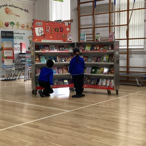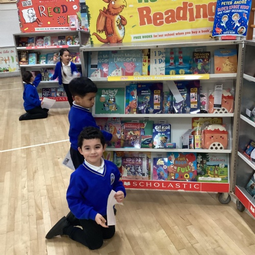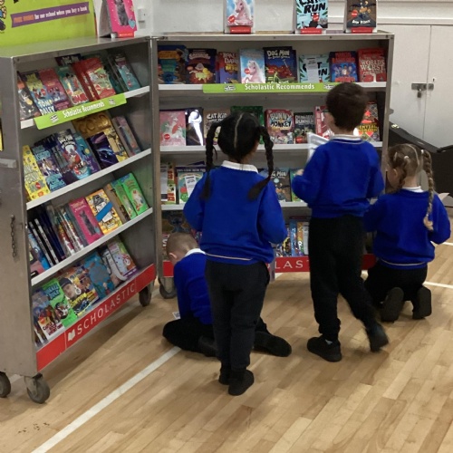Year 1 choosing and browsing books at Our Book Fair